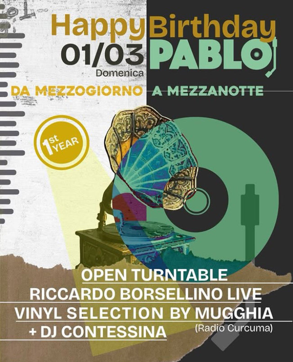 Pablo compie un anno! Per l'occasione da Mezzogiorno a Mezzanotte ci saranno: Open Turntable - Live: Riccardo Borsellino - Vinyl Selection (by Radio Curcuma) - DJ Contessina